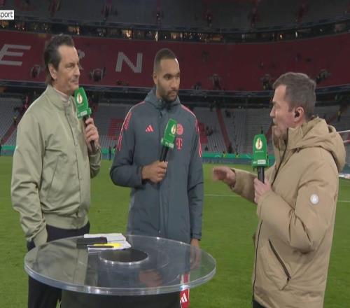 德國杯1/4決賽,拜仁2-0戰(zhàn)勝萊比錫,拜仁后衛(wèi)約納坦-塔賽后接受了天空體育的采訪。約納坦-塔在我們身邊。歡迎來...