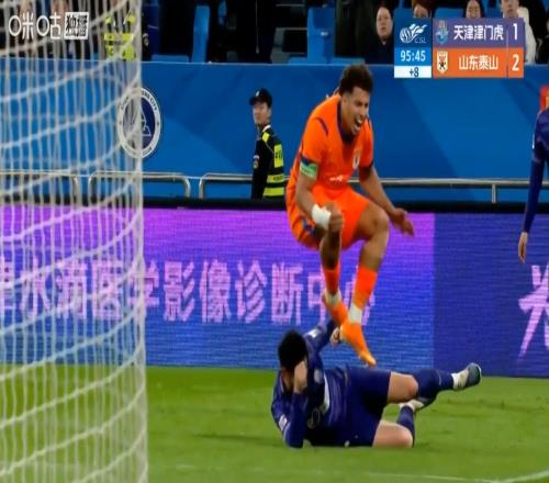 中超第7輪天津津門虎1比2山東泰山的比賽中,罕見地出現(xiàn)一次全身騰空式“雙腿飛鏟”,然而主裁判僅僅掏出黃牌進(jìn)...