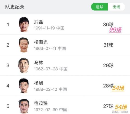 在國家隊,武磊以99場比賽進36球的數(shù)據(jù)排在歷史射手榜的首位,但是要論效率他依然不是最佳的那個。比如楊旭和宿茂臻的進球數(shù)雖然只有28個和27個,但是他倆的出場次數(shù)均只有54次。