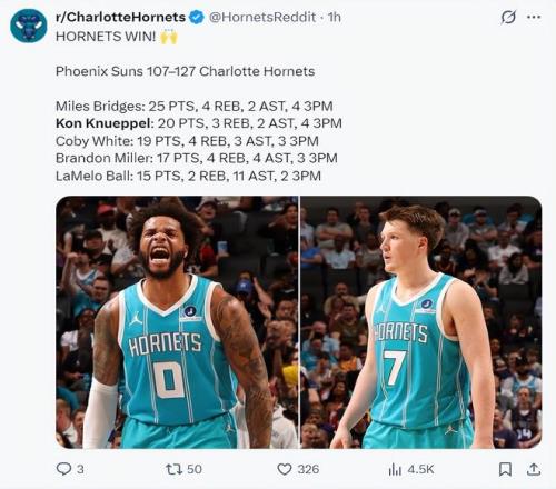 這場(chǎng)比賽邁爾斯-布里奇斯拿到25分4籃板,克努佩爾20分4個(gè)三分,米勒17分4籃板4助攻,鮑爾15分11助攻,科比懷特19分4籃板,格威10分7籃板。本賽季年輕的黃蜂已經(jīng)成為東區(qū)的攪局者。