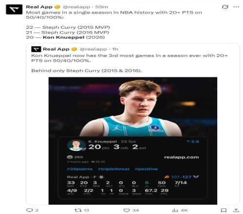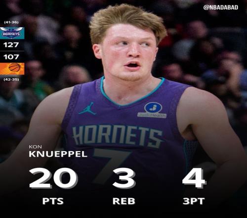 此役新秀克努佩爾32分鐘,14中7,三分9中4,罰球2中2,拿到20分3籃板2助攻,命中率50%,三分命中率44.4%,真實(shí)命中率67.2%,正負(fù)值+5。此役對(duì)于克努佩爾來(lái)說(shuō)是里程碑的夜晚。