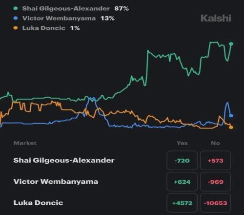 體育預(yù)測平臺(tái)Kalshi Sports第一時(shí)間更新了本賽季常規(guī)賽MVP概率,東契奇暴跌至1%,亞歷山大87%高居榜首,文班亞馬13%排名第二。
