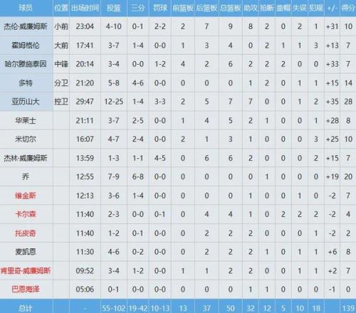 全隊(duì)總投籃數(shù)102中55,命中率高達(dá)約54%。