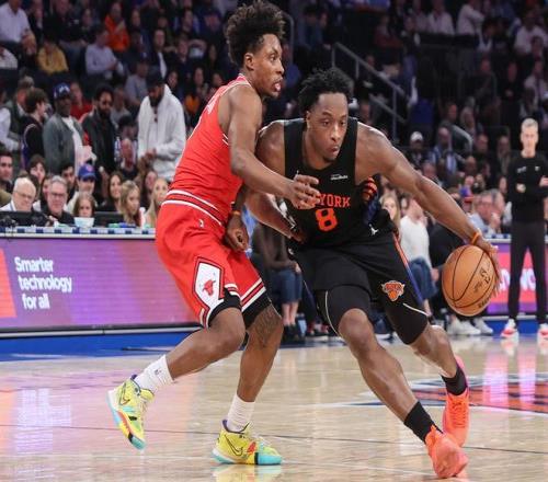 尼克斯狂勝公牛,阿奴諾比外線手感火熱。第二節(jié)他單節(jié)13分,上半場(chǎng)投籃10中6,三分7中5,罰球2中2,砍下19分5籃板2助攻1蓋帽。