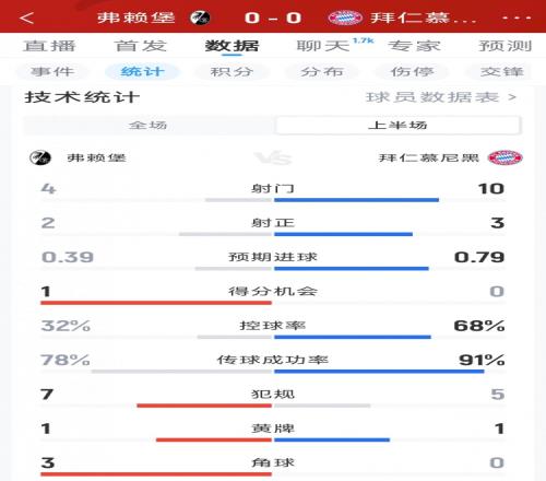 體育播報(bào)4月4日宣 本輪德甲拜仁對(duì)陣弗賴堡上半場(chǎng)戰(zhàn)罷,雙方暫時(shí)互交白卷,以下為雙方半場(chǎng)數(shù)據(jù)對(duì)比: