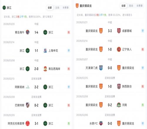 新賽季中超已進行3輪,浙江與重慶銅梁龍都是3輪不敗,浙江2勝1平積2分(被罰5分)排第8,升班馬重慶銅梁龍1勝2平積5分排第5。