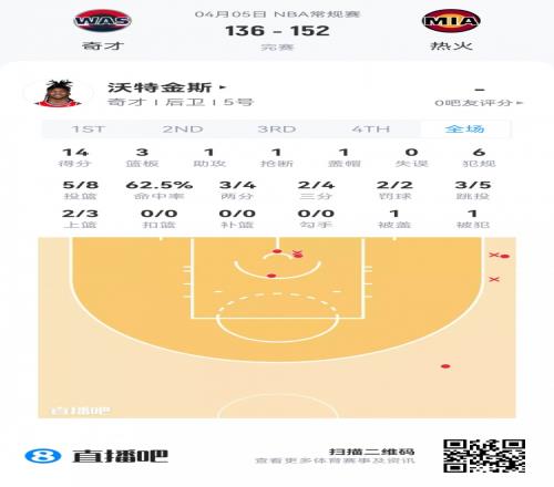 奇才次輪43號(hào)秀沃特金斯 登場(chǎng)18.8分鐘
