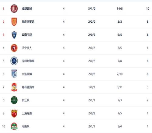 成都蓉城以10分領(lǐng)跑,重慶銅梁龍以8分排名第2位,云南玉昆、遼寧鐵人、深圳新鵬城、大連英博同積6分。上海申花、青島海牛同積-4分,天津津門虎則以-9分墊底。