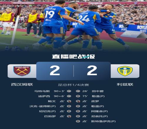 最終,比賽進(jìn)入了點(diǎn)球大戰(zhàn)。利茲聯(lián)首輪罰球,皮羅的點(diǎn)球被赫里克撲出,而鮑文的點(diǎn)球同樣被佩利擋出。接下來的輪次中,勒溫和彼得斯先后罰進(jìn),阿隆森和紹切克均得分,而尼翁托的點(diǎn)球進(jìn)門死角,巴勃羅的點(diǎn)球被佩利撲下,最后斯特魯伊克罰進(jìn)制勝點(diǎn)球,利茲聯(lián)以總比分6-4戰(zhàn)勝西漢姆聯(lián),順利晉級足總杯四強(qiáng)。