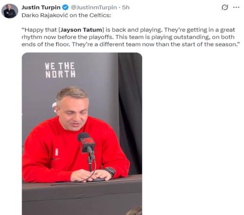 就連猛龍主帥拉賈科維奇談到這支綠凱時都贊不絕口:很高興塔圖姆回歸了。在季后賽來臨前他們已經(jīng)進(jìn)入一個很好的狀態(tài),這支球隊(duì)非常出色,無論是進(jìn)攻還是防守都做得很好,與賽季初相比,這支球隊(duì)因?yàn)樗D姆的加入截然不同了。