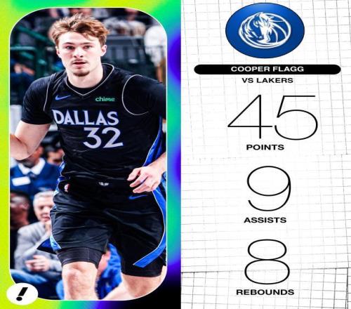 全場比賽,弗拉格轟下45分8籃板9助攻,加上此前一戰(zhàn)他拿到51分,連續(xù)兩戰(zhàn)合計96分令弗拉格成為張伯倫之后連續(xù)2場得分最高的新秀。這也是他生涯第4次40+,超越詹姆斯成為NBA歷史不滿20歲砍40+最多的球員。