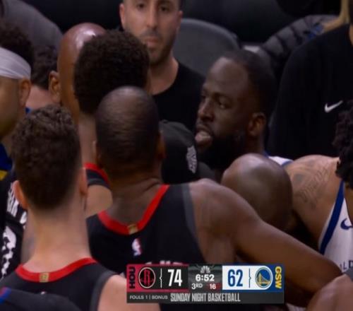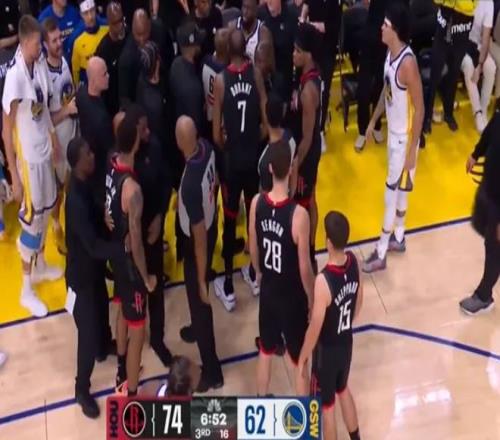 在第三節(jié)比賽進(jìn)行到中段時(shí)刻,追夢(mèng)格林接球后被小賈巴里-史密斯犯規(guī),結(jié)果追夢(mèng)格林先是用球砸向站在他面前的小賈巴里-史密斯,隨后還主動(dòng)走上去撞小賈巴里-史密斯的肩部。兩人隨即發(fā)生肢體糾纏與口角沖突,雙方球員也是圍攏上去制止事態(tài)進(jìn)一步發(fā)展。