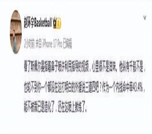 媒體人趙環(huán)宇對此發(fā)表尖銳評論,直指斯佩爾曼“配不上如此態(tài)度”:“他一個內線命中率僅43.4%、表現(xiàn)遠未達預期的外援,能在CBA留隊已是僥幸,竟敢對一位為中國女籃重振雄風立下汗馬功勞的功勛教練指手畫腳?”他強調,許利民曾帶領中國女籃從奧運會歷史最差戰(zhàn)績中突圍,奠定世界杯亞軍基石,是實至名歸的中國籃球名人堂級人物。而斯佩爾曼此前在韓國聯(lián)賽輾轉,如今卻以“被雇傭者”身份對本土功勛教練施壓,令人心寒。