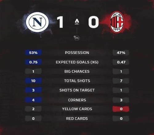 下半場補(bǔ)時5分鐘。最終全場比賽結(jié)束,那不勒斯1-0米蘭。