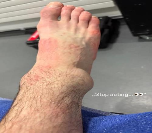 慎入,利茲球員施塔赫展示自己嚴(yán)重腫脹的腳踝,以回?fù)糍|(zhì)疑者