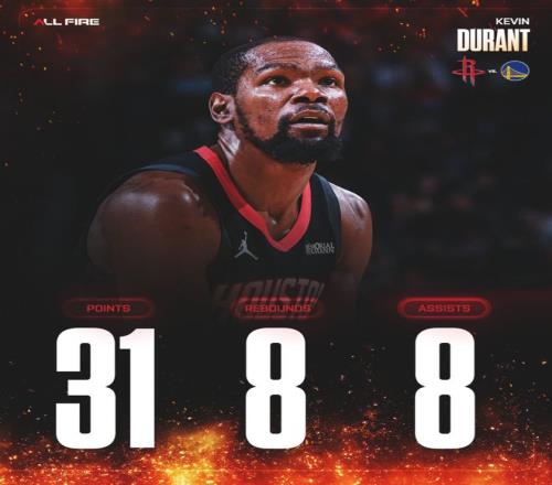 休媒Bradeaux寫道:從未想過有一天杜蘭特穿上火箭球衣與斯蒂芬-庫里競爭。這場比賽后杜蘭特已經(jīng)拿到第28次30+,這是他最近10個賽季最多的一次,也就是37歲的他比肩了27歲的他。