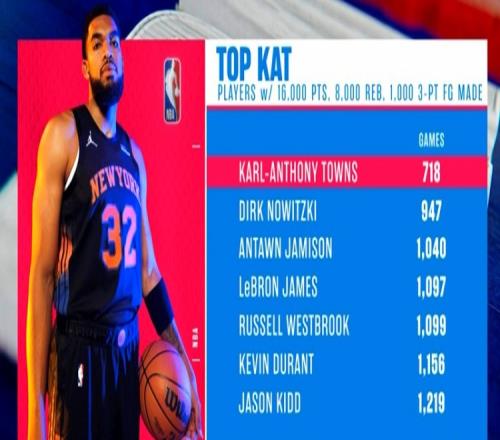 在今天的戰(zhàn)勝老鷹的比賽中,尼克斯中鋒唐斯達成生涯16000分8000籃板1000三分的成就,是歷史第七個達成這一成就的球員。