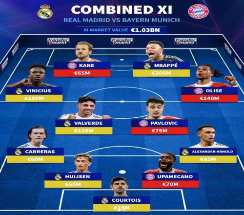北京時間4月7日,在歐冠1/4決賽首回合皇家馬德里主場與拜仁慕尼黑的焦點戰(zhàn)即將打響的情況下,德轉(zhuǎn)列出了兩支球隊目前身價最高的11人陣容,皇馬7人入選,姆巴佩2億歐元領(lǐng)銜,拜仁占據(jù)4席。