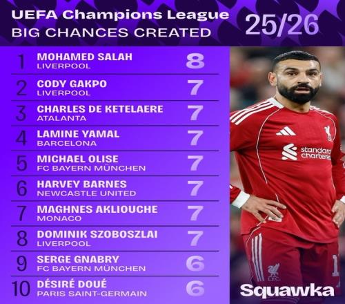 本賽季歐冠創(chuàng)造重大機會榜薩拉赫領(lǐng)銜紅軍3將亞馬爾奧利塞在列