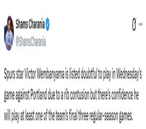 北京時(shí)間4月8日,據(jù)名記Shams報(bào)道,馬刺方面并不認(rèn)為文班亞馬遭遇嚴(yán)重傷病。文班亞馬昨晚對(duì)肋骨部位拍了X光,結(jié)果顯示無(wú)結(jié)構(gòu)性損傷。他今天晚些時(shí)候還會(huì)接受進(jìn)一步檢查,但球隊(duì)目前抱有希望、也持樂(lè)觀態(tài)度,后續(xù)檢查結(jié)果會(huì)和昨晚一致——預(yù)計(jì)傷情并不嚴(yán)重。明日對(duì)開(kāi)拓者他被列為小概率出戰(zhàn),但外界預(yù)計(jì)他最后三場(chǎng)至少打一場(chǎng)。