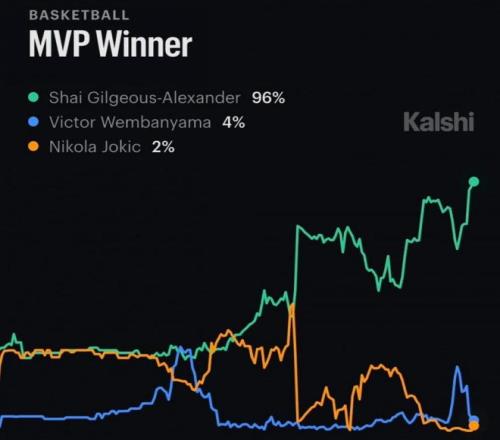 文班亞馬本賽季心氣很高,人氣也高,首次入選全明星,而且還是MVP候選人。最新一期的MVP排行榜中,文班亞馬就高居榜首,力壓SGA和約基奇。不過就在今天,知名預(yù)測平臺Kalshi更新了最新的MVP獲獎概率,SGA高達(dá)95.5%,文班亞馬只有3.5%,約基奇只有1.5%,如果Kalshi預(yù)測準(zhǔn)確,那么SGA基本鎖定MVP了。本賽季亞歷山大場均31.4分4.4籃板6.5助攻1.4搶斷,文班亞馬場均24.8分11.5籃板3.1助攻1搶斷3.1蓋帽,約基奇場均28分12.9籃板10.9助攻1.4搶斷。這三人大概率都會入選最佳陣容一陣。