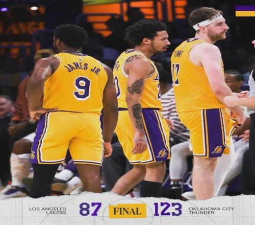 第四節(jié)雙方換上純替補(bǔ)陣容,雷霆單節(jié)30-25凈勝5分。全場(chǎng)結(jié)束,雷霆123-87大勝湖人36分,本賽季4比0橫掃湖人。這四場(chǎng)比賽,雷霆分別凈勝29分、9分、43分和36分,合計(jì)117分。最近一周,雷霆兩次跟湖人交手,贏了79分!
