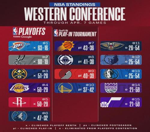 西部直通季后賽的六支球隊(duì)全部確定,分別是雷霆、馬刺、掘金、湖人、火箭和森林狼。