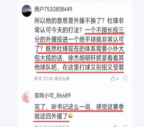 在杜鋒看來,昨晚的排兵布陣是正確的,麥考爾仍然值得信賴??墒菑V東球迷聽了杜鋒新聞發(fā)布會的發(fā)言,心里涼了半截。他們說,“完了,聽書記這么一說,感覺這賽季就這四外援了”、“一個不擅長投三分的外援投進(jìn)一個絕平球就非常認(rèn)可了?既然杜鋒現(xiàn)在的體系需要小外大包大攬的話,徐杰胡明軒抓緊看看其他球隊吧,在這里打球又別扭又受罪”。