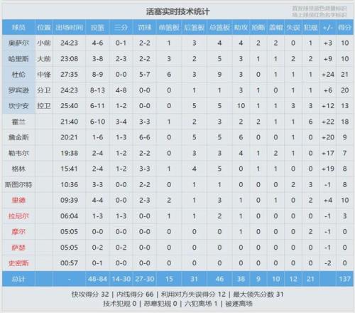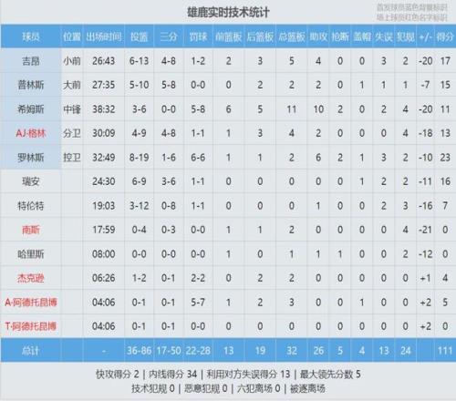今天四節(jié)比分如下(雄鹿在前):28-34、29-41、29-37、25-25??矊幇彩装l(fā)出戰(zhàn)25分40秒,11投6中拿到13分5籃板10助攻1搶斷1蓋帽3失誤,正負值+12??矊幇伯吘谷齻€星期沒打比賽了,還需要一點時間找到之前的狀態(tài)。
