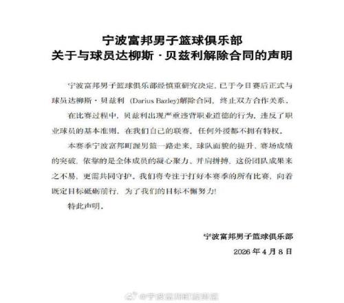 在8日晚與上海隊(duì)的比賽中,本賽季常規(guī)賽第二階段加盟寧波隊(duì)的外援貝茲利在發(fā)底線球時(shí)出現(xiàn)失誤,此后他情緒失控,與隊(duì)友發(fā)生了口角并推了隊(duì)友一把。沖突發(fā)生后,寧波男籃教練組立即讓貝茲利離場(chǎng)返回更衣室。比賽結(jié)束后,球隊(duì)做出了與他解約的決定?!柏惼澙霈F(xiàn)嚴(yán)重違背職業(yè)道德的行為,違反了職業(yè)球員的基本準(zhǔn)則,在我們自己的聯(lián)賽,任何外援都不擁有特權(quán)?!睂幉谢@在官方聲明中寫道。