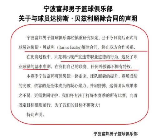 寧波隊(duì)方面表示,外援貝茲利,出現(xiàn)嚴(yán)重違背職業(yè)道德的行為,因此,正式解除雙方的合同。與此同時(shí),寧波隊(duì)還表示CBA聯(lián)賽是我們自己的聯(lián)賽,任何一個(gè)外援,都是不擁有特權(quán)!