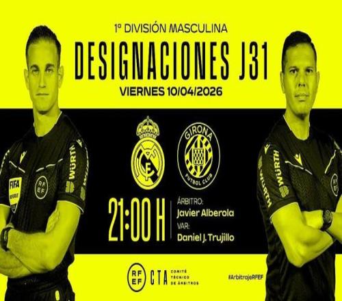 4月9日,西班牙足協官方公布了西甲第31輪周五比賽皇馬vs赫羅納的裁判安排,哈維爾-阿爾韋羅拉將擔任主裁。