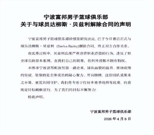 比賽第三節(jié)尚未結(jié)束,多家體育平臺(tái)已收到內(nèi)部消息;終場(chǎng)哨響18分鐘后,俱樂(lè)部官微同步推送解約公告,標(biāo)題直指核心:“關(guān)于立即終止與外援達(dá)柳斯·貝茲利合同的聲明”。