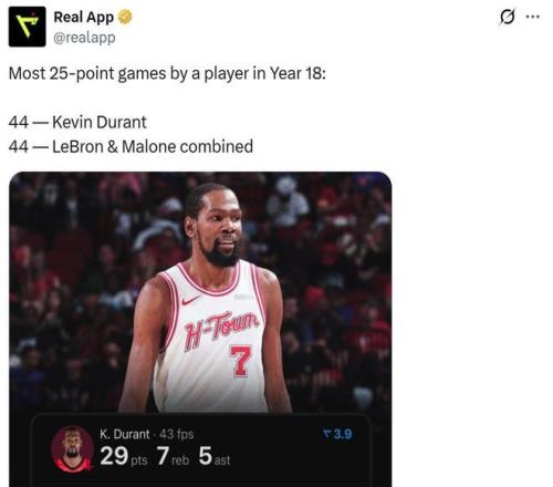 憑借這樣的表現,杜蘭特在生涯第18個賽季已經44次砍下25+得分,斷檔排名NBA歷史第一。