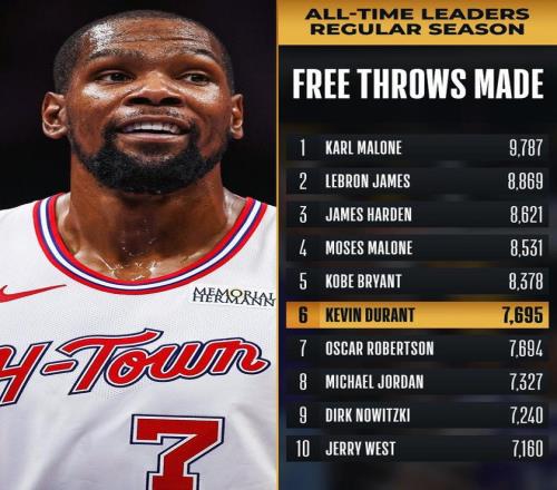 罰球總數也迎來里程碑,成功超越大O升至NBA歷史第六,下一步將追逐第五名的科比。