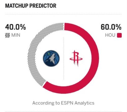 今日ESPN給出本場(chǎng)勝率預(yù)測(cè),火箭為60%占優(yōu),森林狼為40%。