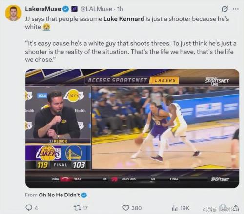 湖人以119-103大勝勇士,終結(jié)三連敗,重新回到西部第四。本場(chǎng)比賽詹姆斯、艾頓、布朗尼均有亮眼發(fā)揮,但賽后主帥雷迪克,卻重點(diǎn)盛贊了盧克·肯納德。