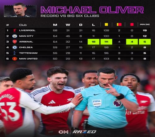 在自己的執(zhí)法生涯中,奧利弗共對阿森納出示了111張黃牌和4張紅牌,比任何其他英超球隊(duì)都要多。奧利弗執(zhí)法的阿森納比賽場次和曼城一樣多,均為64場,但他從未向后者出示過紅牌。