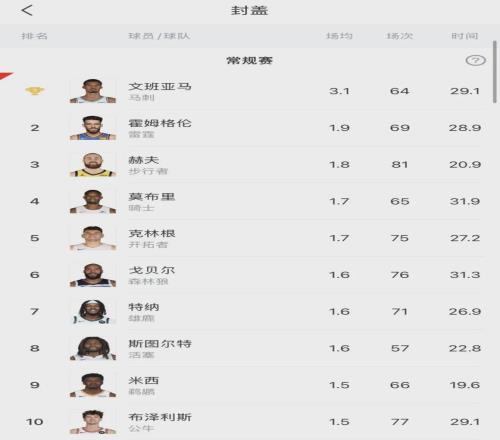 本賽季文班打了64場常規(guī)賽,其中54場首發(fā)。場均出戰(zhàn)29.1分鐘,得到25分11.5籃板3.1助攻1搶斷3.1蓋帽2.4失誤2.4犯規(guī),三項命中率:51.2%,34.9%,82.7%。場均得分聯(lián)盟第13,場均籃板聯(lián)盟第4,場均蓋帽聯(lián)盟第1!