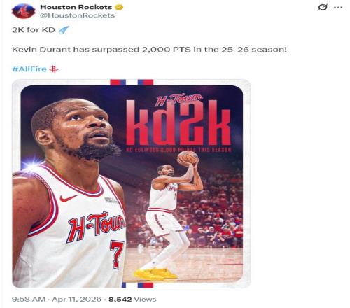 杜蘭特本賽季完成2000分里程碑,超越卡爾-馬龍成為NBA歷史上年齡最大單賽季2000分的球員。