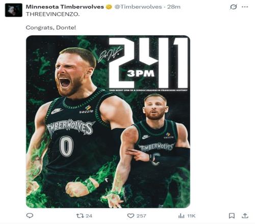 迪溫琴佐迎來(lái)里程碑,他本賽季已經(jīng)命中241個(gè)三分球生涯新高。