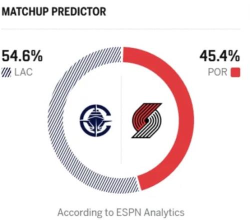 這場比賽不只是附加賽的關(guān)鍵卡位對決,甚至有可能提前預(yù)演附加賽第二輪、爭奪西部最后一張季后賽門票的較量,雙方必然會拼盡全力爭勝。本月初兩隊交手時,開拓者曾在客場114-104擊敗快船,結(jié)合開拓者近期的狀態(tài),此番坐擁主場優(yōu)勢,他們的取勝機會或許更大。ESPN預(yù)測本場比賽:快船勝率54.6%,開拓者勝率45.4%。