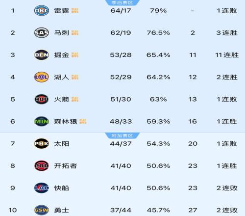 隨著湖人大勝太陽(yáng),掘金贏雷霆,火箭輸球,西部前10排名基本確定