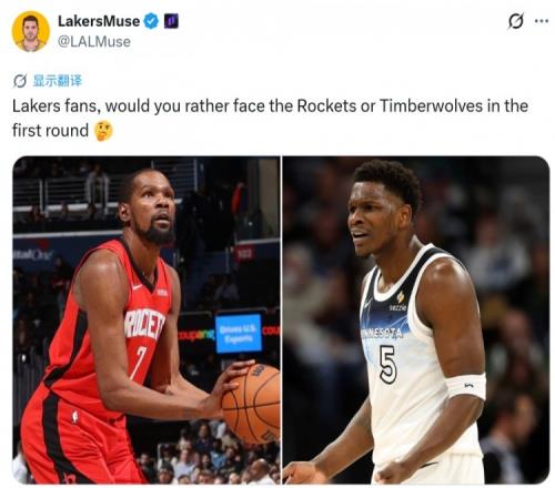 賽后湖人媒體LakersMuse發(fā)問寫道:“湖人球迷們,你們更想在季后賽首輪打火箭還是森林狼呢?