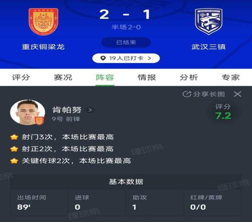 這應(yīng)該是今年中超最超值的引援了吧。重慶銅梁龍今天又贏了,而且只花了5萬(wàn)歐元的新外援肯帕努貢獻(xiàn)精彩助攻,加上全場(chǎng)最高的2次關(guān)鍵傳球和2次射正,他的表現(xiàn)幾乎完美,本賽季他已經(jīng)貢獻(xiàn)2球1助攻,數(shù)據(jù)相當(dāng)驚艷,3個(gè)細(xì)節(jié)可以探討一下。