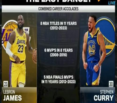 4月11日,在此前湖人對陣勇士的比賽中,媒體打出一列數(shù)據(jù),詹姆斯和庫里在11年里拿下8個(gè)總冠軍,8年里6個(gè)MVP,11年里獲得5個(gè)總冠軍FMVP。