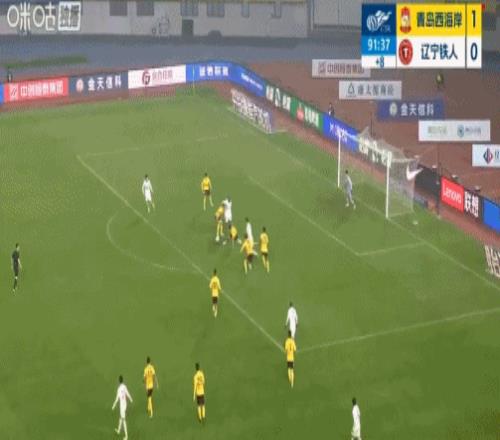 第90+3分鐘,補(bǔ)時(shí)階段李浩然禁區(qū)外折射破門,遼寧鐵人1-1扳平西海岸。