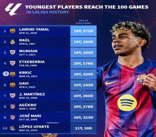 西甲最年輕百場(chǎng)榜:亞馬爾壓勞爾居首,加維、哈馬、阿圭羅在列