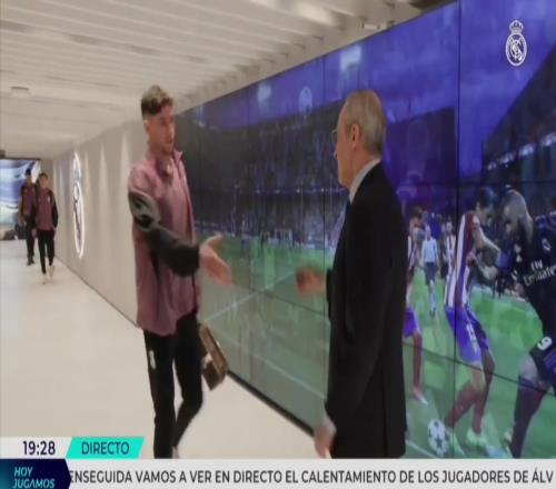 在與巴爾韋德握手時(shí),弗洛倫蒂諾輕輕給了巴爾韋德一巴掌,而在碰到貝林厄姆時(shí)則與其交流了幾句。