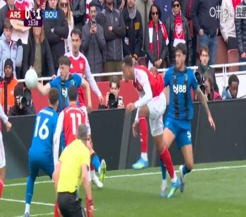 體育播報04月11日宣 阿森納vs伯恩茅斯第34分鐘,阿森納開出角球,亂戰(zhàn)中加布里埃爾射門打在克里斯蒂手上,主裁奧利弗判罰點球!